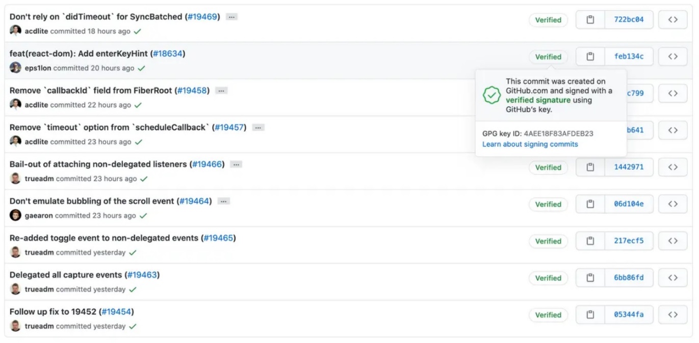 بیشتر کامیتهای موجود در ریپازیتوری ریاکت توسط کلید GPG تأیید میشود.