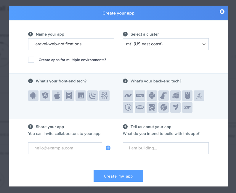 در ابتدا باید یک حساب کاربری Pusher بسازید، و سپس برنامه خود را به مانند اسکرینشات زیر راهاندازی کنید: