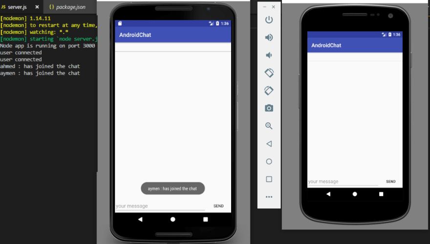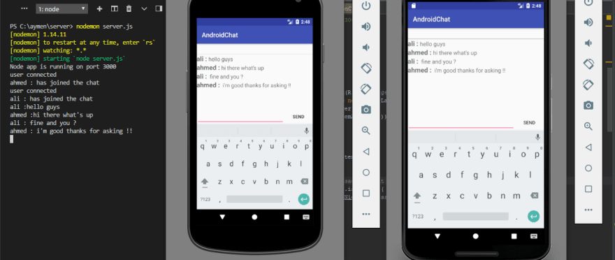 همانطور که در اسکرینشات زیر میتوانید ببینید، همه چیز به درستی کار میکند و پیامها برای هر دو طرف نمایش داده میشوند. دقت کنید که با چندین کاربر دیگر نیز میتوانیم وارد شویم، اما باید از شبیهسازهای دیگر استفاده کنیم.