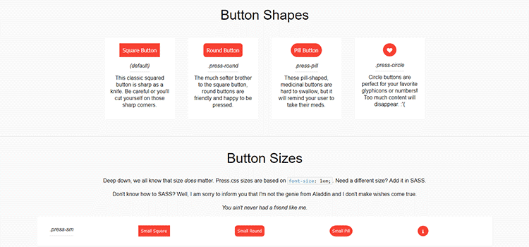 Press.css برای شما دکمه های فلت را در هر سایز، شکل و رنگی که بخواهید می سازد. با داشتن فقط سه جلوه برای افکت، کدهای این کتابخانه دارای حجم کمتری از ۱۲ کیلوبایت هستند. همچنین این کتابخانه بدون مشکل از فونت های FontAwesome پشتیبانی می کند.