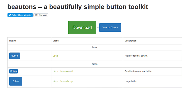 Beautons یک کتابخانه برای دکمه ها است که تماما بر اساس سادگی ساخته شده است. می توانید در بین اندازه ها، استایل ها و دکمه های مختلف انتخاب کنید. کلاس های سی اس اس در این حالت می توانند با هم مخلوط شوند و در نهایت می توانید استایل متفاوتی را بسازید.