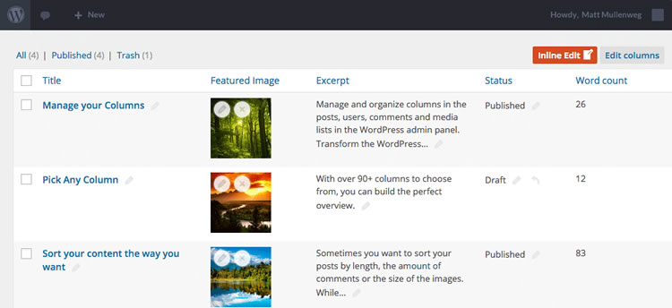 در این افزونه بیشتر از ۱۶۰ ستون قرار گرفته شده که می توانید از آنها استفاده کنید. برای مثال می توانید اطلاعات مربوط به تصویر شاخص هر پست را در قسمت همه نوشته ها قرار دهید. جدای از نمایش ستون های مختلف می توانید با استفاده از آنها مرتب سازی و فیلترینگ مناسبی را روی پست ها ایجاد کنید. این افزونه برای انواع مختلف پست ها کار می کند و همچنین توانایی ادغام با افزونه های مختلفی از جمله Advanced Custom Fields و ووکامرس را دارد.