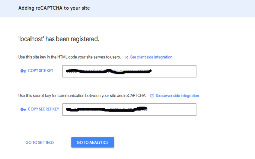 پس از ارسال فرم، گوگل کلید مخفی سایت را برای دامنه شما ایجاد میکند، به این صورت که در تصویر زیر نشان داده شده است:
