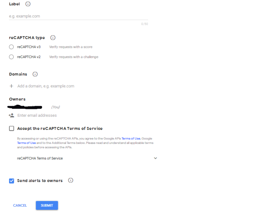 در قسمت reCAPTCHA Type، گزینه reCAPTCHA v3 را انتخاب کنید. اطلاعات دامنهها و مالکین را در صورت لزوم پر کنید. در مرحله بعد، شرایط خدمات reCAPTCHA را بخوانید و بپذیرید. در آخر برای ذخیره تنظیمات بر روی دکمه ارسال کلیک کنید.