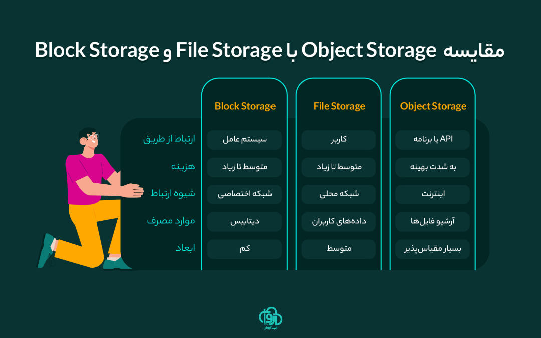 فضای ابری که به نام Object Storage هم شناخته میشود، معماری و تکنولوژی جدیدی برای ذخیرهی دادههاست که با سیستمهای سنتی تفاوت دارد. برای ذخیره سازی فایلها به روش سنتی و مدرن، از راهکارهای مختلفی استفاده میشود. در حال حاضر سه روش زیر بیشترین کاربرد را دارد: