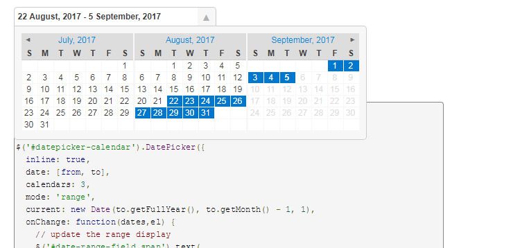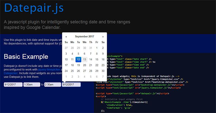 اگر دنبال مورد سادهتری نسبت به گزینه سوم این لیست هستید، پیشنهاد می کنم از Datepair.js استفاده کنید. این افزونه براساس ورودی دوگانه درست شده است، بدین معنا که شما ابتدا مقدار اول یا تاریخ آغاز را انتخاب می کنید و سپس مقدار دوم یا تاریخ پایان. همچنین زمان بندی رنِجی نیز در این افزونه تعبیه شده است که بسته به پیکربندی هایی که انجام میدهید می توانید آن حالت را نیز فعال کنید.