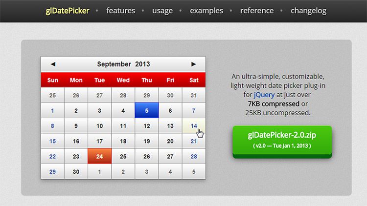اگر دنبال یک افزونه پر از جزئیات و ویژگی های زیاد میگردید، پیشنهاد من استفاده از افزونه glDatePicker است. با وجود آنکه ویژگی های زیادی در این افزونه قرار دارد اما این مورد بسیار سبک است و حجمی حدود ۷ کیلوبایت دارد.