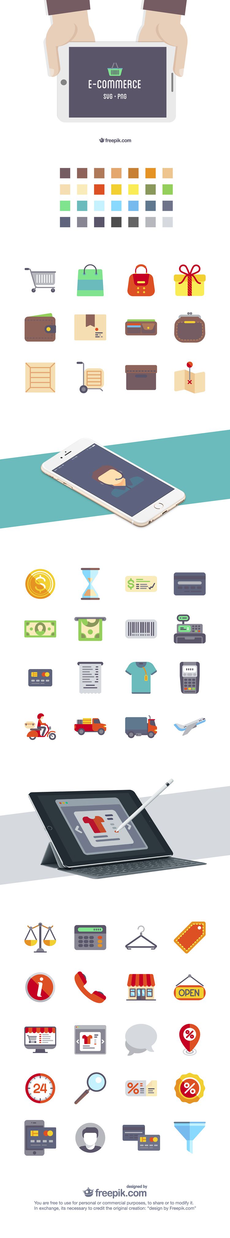 وبسایت Freepik به تازگی مجموعه آیکون بسیار زیبایی برای وبسایت های فروشگاهی ارائه داده است که قصد داریم در این مطلب آن را برای شما معرفی کنیم. این مجموعه به صورت فلت طراحی شده و همراه با ۵۰ آیکون عرضه می شود. این مجموعه تمام جنبه های یک وبسایت فروشگاهی را در نظر گرفته است که شامل کارت خرید، سبد خرید، آیکون های پرداخت، آیکون دریافت، دسته بندی های خرید و موارد بسیار زیاد دیگر می شود. این مجموعه در دو فرمت SVG و PNG ارائه شده است و شما می توانید در پروژه های شخصی و تجاری از آن ها استفاده کنید.