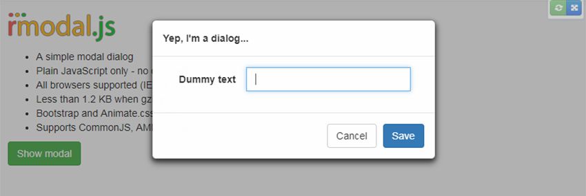 rmodal.js یک پنجره Modal طبیعی است که تقریبا با هر وبسایتی به خوبی کار می کند. این مورد مبتنی بر هیچ کتابخانه جاوااسکریپتی نیست و حجم بسیار کمی (در حدود 1.2 کیلوبایت) دارد.