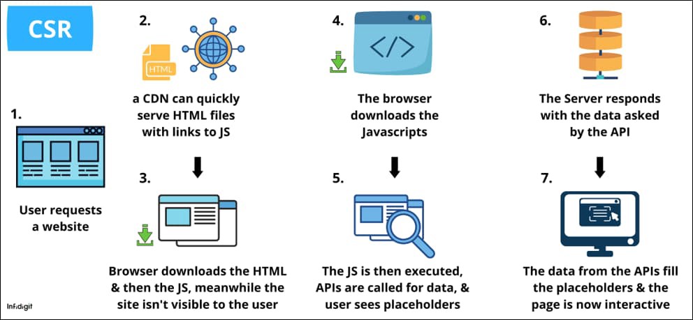 رندر سمت مشتری به معنای رندر گرفتن مستقیم از صفحات در مرورگر (با استفاده از جاوا اسکریپت) است. تمام فرآیندهای واکشی دادهها، قالببندی و مسیریابی، به جای سرور در مرورگر مشتری پردازش میشوند. سرور در CSR یک صفحه HTML خالی و یک باندل جاوا اسکریپت را بازگردانی میکند.