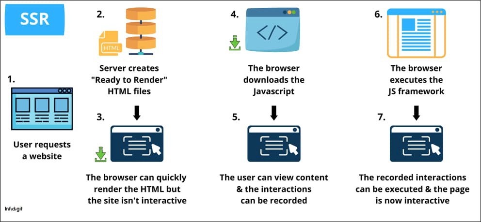 رندر سمت سرور به توانایی یک اپلیکیشن در ایجاد صفحه وب روی سرور گفته میشود. سمت سرور یک صفحهی کاملاً رندر شده را در اختیار مشتری قرار میدهد. سپس باندل جاوا اسکریپت مشتری به فریمورک SPA امکان اجرا شدن میدهد. از آنجایی که صفحات در سرور رندر گرفته و سپس برای مشتری ارسال میشوند، امکان استفاده از دادههای پویا و حفظ SEO عالی فراهم میشود.