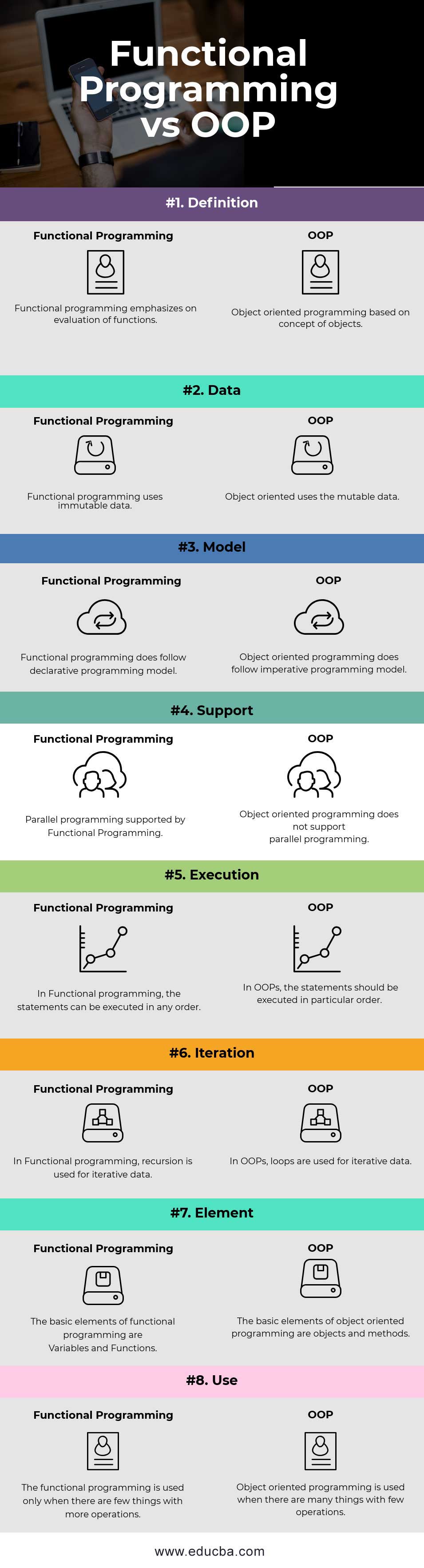 برنامه نویسی فانکشنال یک تکنیک برنامه نویسی است که فاکتورهای فانکشنال مورد نیاز برای ایجاد و اجرای برنامهها را برجسته و به آن اهمیت میدهد. OOP یا برنامهها شیگرا، تکنیکهای برنامه نویسی مفهومی هستند که از اشیا بهعنوان کلید استفاده میکنند. مدل برنامه نویسی مورد استفاده در برنامه نویسی فانکشنال، یک مدل برنامه نویسی اعلانی یا Declarative است؛ درحالیکه برنامه نویسی شیگرا از مدل برنامه نویسی دستوری دستوری یا imperative استفاده میکند. در برنامه نویسی فانکشنال، متغییرها و توابع عناصر اصلی کد هستند، درحالیکه در برنامه نویسی شیگرا، آبجکتها و متدها عناصر اصلی هستند. (مقالهی تفاوت بین برنامهنویسی اعلانی و دستوری را بخوانید)