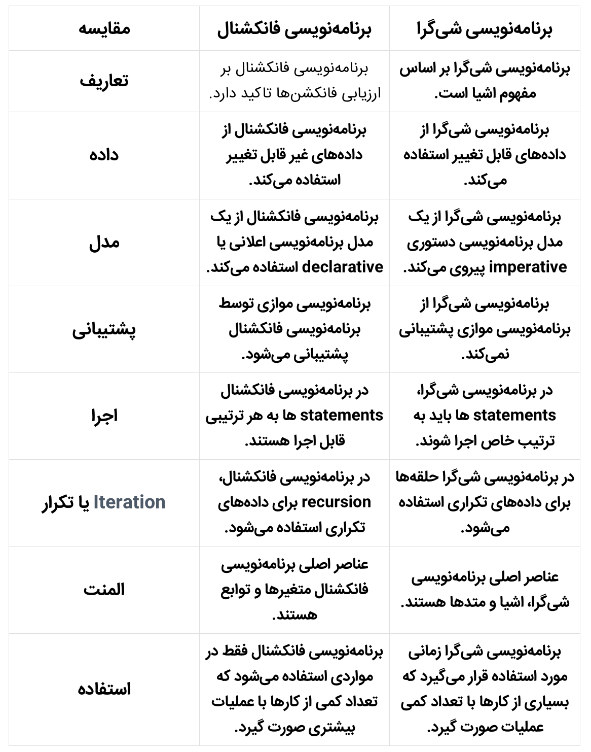 در زیر جدول مقایسه بین برنامه نویسی فانکشنال در مقابل برنامه نویسی OOP یا شیگرا آورده شده است.