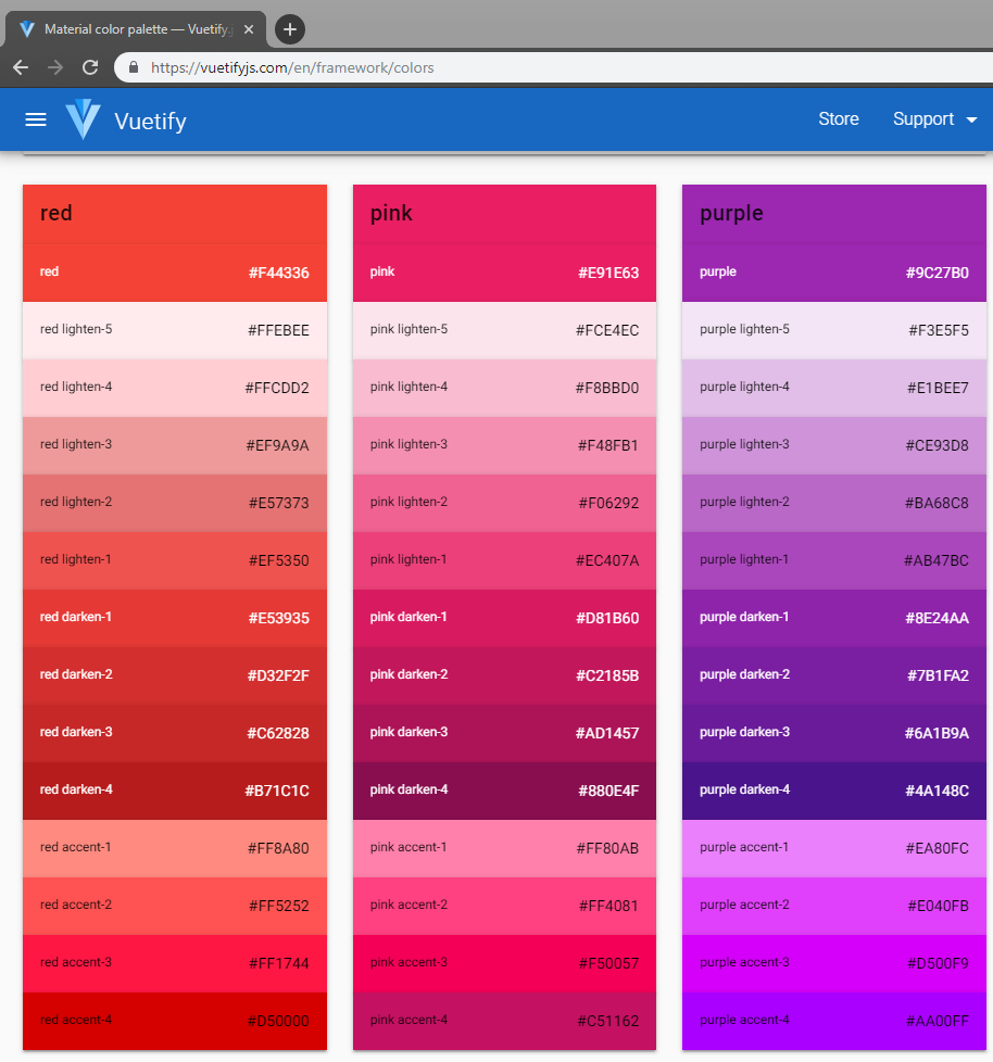 برای مشاهده دقیق رنگهای این کتابخانه میتوانید به این صفحه از مستندات Vuetify مراجعه نمایید.
