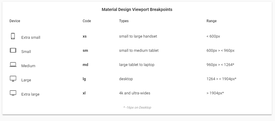Vuetify از یک سیستم شبکهای یا گرید ۱۲ نقطهای استفاده میکند. این قسمت از کتابخانه از مدل لایهبندی فلکسباکس استفاده میکند. همچنین این سیستم از ۵ breakpoint پشتیبانی میکند که میتوانید آنها را در زیر مشاهده کنید.