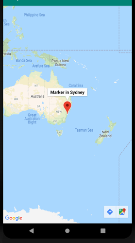 با تنظیم همه موارد میتوانید برنامه خود را روی تلفن فیزیکی یا شبیهساز اندروید نصب کنید. با اجرای برنامه مشاهده میکنید که گوگل مپ بارگزاری شده و مرکز آن بر روی استرالیا است که یک نشانگر روی شهر سیدنی قرار داده شده است. اگر بر روی نشانگر کلیک کنید، یک پنجره کوچک روی آن ظاهر میشود که میگوید: "marker in Sydney". همچنین ممکن است در گوشه پایین سمت راست متوجه چند نماد شوید که شمار را به برنامه استاندارد گوگل هدایت میکند.