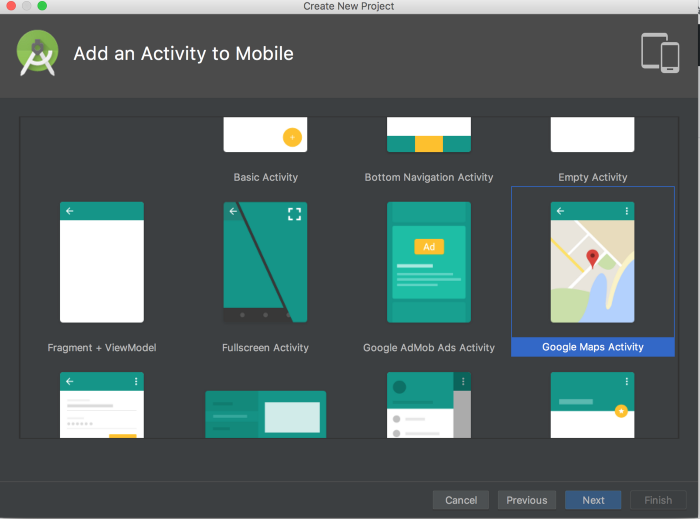 همانطور که گفتیم دراین بخش قصد داریم که معرفی و راهاندازی گوگل مپ اندروید را با هم بررسی و پیادهسازی کنیم. برای سهولت کار، ما یک پروژه جدید از طریق اندروید استودیو ایجاد میکنیم و قالب google map activity را برای آن انتخاب میکنیم.