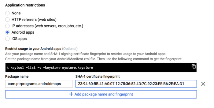 به کنسول google api برگردید و بر روی دکمه RESTRICT KEY در پنجره popup حاوی کلید Api کلیک کنید. در صفحه بعد که ظاهر میشود، Android apps را در زیر Application restrictions انتخاب کنید، روی دکمه Add Package name and fingerprint کلیک کنید، و سپس نام پکیج خود و SHA-1 که قبلا ایجاد کردید را اضافه کنید.