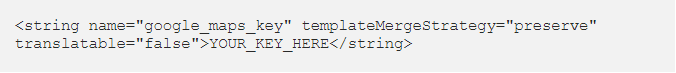 کلید را کپی کنید و به پروژه اندروید استودیو خود برگردید(ولی صفحه مرورگر خود را نبندید، چون دوباره به آن نیاز داریم). قالب پروژه یک فایل به اسم google_maps_api.xml در مسیر res/values/ ایجاد کرده است. آن را باز کنید و کلید Api خود را در آیتم زیر جایی که YOUR_KEY_HERE نوشته شده است جایگذاری کنید.