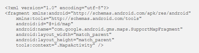 سپس فایل activity_maps.xml را باز کنید. این فایل شامل یک آیتم است: یک فرگمنت که از google maps پشتیبانی میکند. در حالی که عنصر اصلی فرگمنت است، باید متوجه این هم شده باشید که در ویژگی android:name نام کامل کلاس SupportMapFragment آورده شده است.