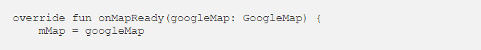 قالب اپلیکیشن ما این کار را با فراخوانی getMapAsync() بر روی شیء supportMapFragment و عبور از OnMapReadyCallback که توسط اکتیویتی با استفاده از کلمه کلیدی this پیادهسازی شده انجام میدهد. پس از بارگیری دادههای نقشه، متد onMapReady() شیء googleMap را دریافت میکند، که پس از آن در سطح کلاس به عنوان متغیر نمونه ذخیره میشود.