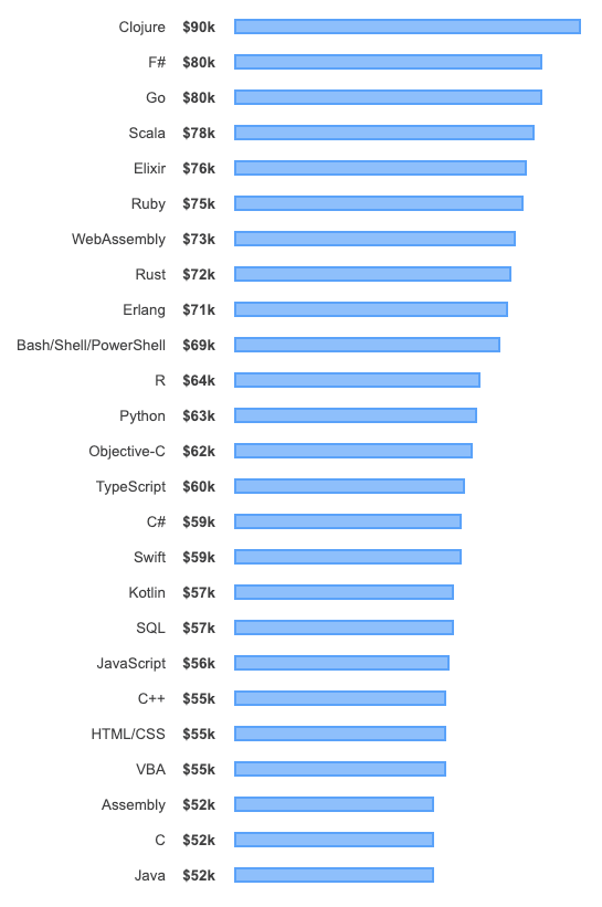 هر چند که بالا بودن درآمد یک زبان برنامهنویسی نشان برتری آن نیست اما میتوان آن را به عنوان یک فاکتور برای یادگیری در نظر گرفت چرا که در نهایت بیشتر افراد قصد دارند از چیزهایی که یاد میگیرند پول بدست بیاورند.