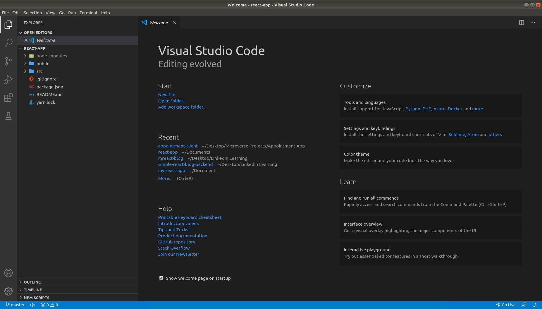 در مرحله بعدی، باید برنامه React خود را از خط فرمان باز کنید. توجه داشته باشید من ازVS Code برای این آموزش استفاده خواهم کرد، اما شما میتوانید از یکی از موارد دلخواه خود استفاده کنید. بنابراین پس از اتمام اجرای برنامه react-app، میتوانید تایپ کنید: