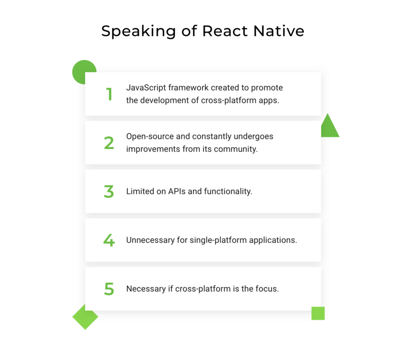 - این ابزار از هدر رفتن پول جلوگیری میکند. سه نکته قبلی به یک برتری قابل ملاحظه ختم میشوند: React Native از هدر رفتن پول شما جلوگیری میکند. این ابزار از ساخت دو برنامه جداگانه سریعتر است و در نتیجه زمان کمتری برای آزمایش و انتشار MVP مورد نیاز است.