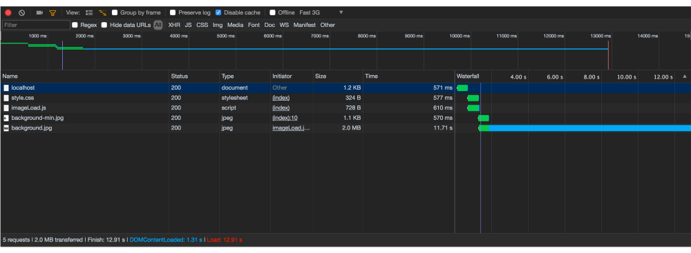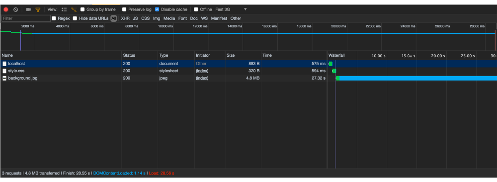 در مثال زیر من یک وبسایت ساده را ساخته و تصویری با حجم ۴.۸ مگابایت را در پس زمینه آن قرار دادم. همانطور که میبینید DOM در عرض ۱.۱۴ ثانیه بارگذاری شده است. بنابراین کاربر محتوای وبسایت را بعد از ۱.۱۴ ثانیه مشاهده خواهد کرد. این زمان در مقابل یک اینترنت 3G بسیار خوب است. با این وجود تصویر پس زمینه بعد از ۲۷.۳۲ ثانیه بارگذاری میشود و کاربر به آرامی ظاهر شدن تصویر را مشاهده میکند. زمانی که تصویر بارگذاری شود، ممکن است کاربر وبسایت شما را ترک کرده باشد.