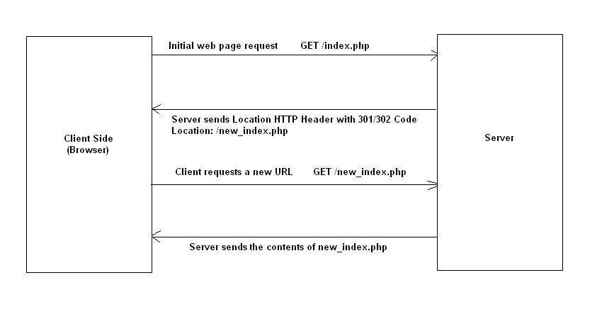 - سرور درخواست فایل index.php را دریافت میکند و میخواهد به مشتری اطلاع دهد که دیگر در دسترس نیست یا در جایی دیگر جابجا شده است و باید به جای آن به دنبال یک فایل جدید باشد: new_index.php. سرور هدر موقعیتیابی را با URL جدید به همراه کد 301 یا 302 HTTP ارسال میکند. اینها کدهای HTTP برای تغییر مسیر هستند.
