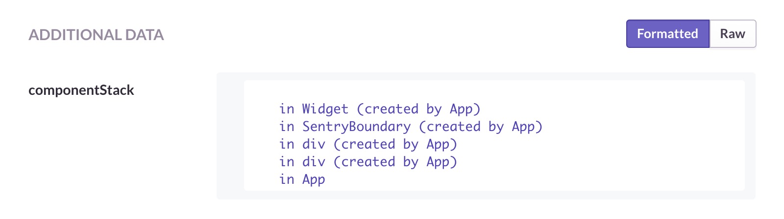 جنبه جالب دیگر componentDidCatch در آرگومان دوم، errorInfo است. در حال حاضر، errorInfo تنها یک ویژگی دارد، و آن componentStack، یعنی یک کامپوننت Stack Trace است. این کاپوننت، مسیر شما برای درخت کامپوننتهای شما، از ریشه برنامه تا مدلها و CodeBaseها است. از آنجایی که این اطلاعات برای حل خطاها خوب است، پیشنهاد میکنیم آن را با خطاهای Sentry به عنوان دادههای اضافی بفرستید.