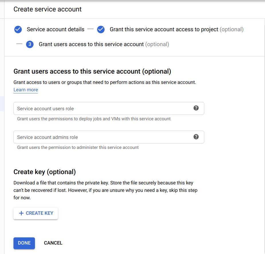 نام و توضیحات حساب سرویس را وارد کنید و روی دکمه Create کلیک کنید.