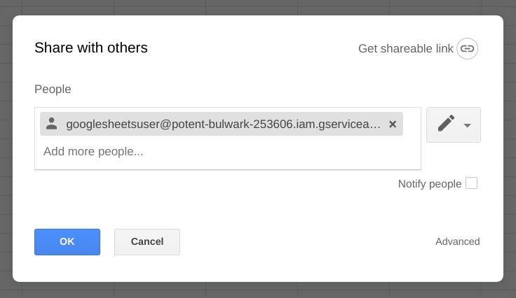 اکنون که یک حساب سرویس داریم، باید صفحه گسترده خود را با آن به اشتراک بگذاریم. این دقیقا مانند اشتراک صفحه گسترده با هر حساب کاربری عادی است. صفحه گسترده را در مرورگر خود باز کنید و بر روی دکمه Share در گوشه بالا سمت راست کلیک کنید. با این کار در جایی که باید آدرس ایمیل حساب سرویس را وارد کنید، یک modal باز میشود. تیک کادر مربوط به Notify people را بردارید، زیرا با این کار ایمیل ارسال میشود و از آنجا که حساب سرویس فاقد هرگونه صندوق پستی است، به شما اعلان عدم موفقیت تحویل ایمیل را میدهد.