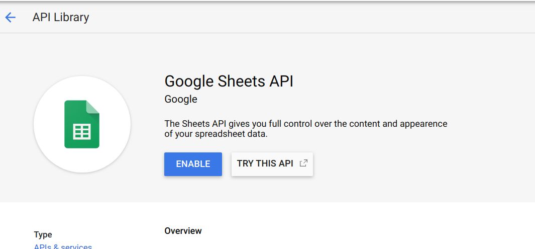 - Google Sheets API را برای پروژه در کنسول Google developers فعال کنید