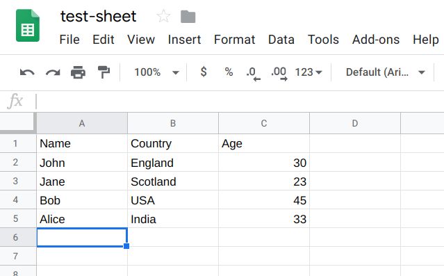 و در این URL، شناسه صفحه گسترده 1-XXXXXXXXXXXXXXXXXXXXXXSgGTwY است و برای هر صفحه متفاوت خواهد بود. آن را یادداشت کنید، زیرا برای دسترسی به این صفحه گسترده به این مورد در اسکریپت Node.js نیاز خواهیم داشت. برای این آموزش، در اینجا دادههایی است که ما در صفحه گسترده خود ذخیره کردهایم: