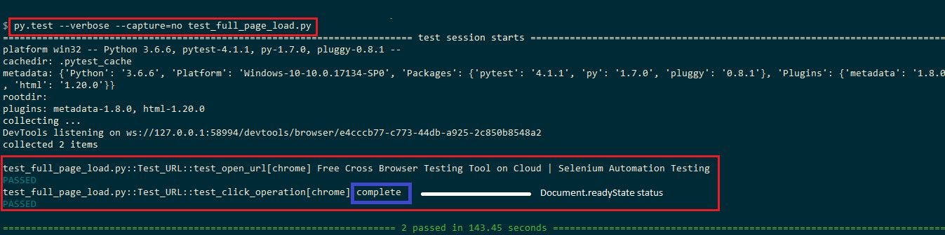 در ()test_click_operation، صفحه وب lambdatest.com بارگیری میشود و پس از آن انتظار برای حداکثر مدت زمان 10 ثانیه انجام میگردد. این از ()wait_for_page_load استفاده میکند تا بررسی شود عنصر owl-example در صفحه وب stale نیست. هنگامی که صفحه وب در داخل timeout بارگذاری میشود، بررسی میکنیم که آیا عنصری وجود دارد که متن FREE SIGN UP را داشته باشد، این دکمهای است که به صفحه ثبت نام لینک میدهد. در آخر با استفاده از ویژگی Document.readyState وضعیت صفحه وب را بررسی میکنیم. وقتی مقدار آن تغییر میکند، یک رویداد readystatechange به شی document ارسال میشود.