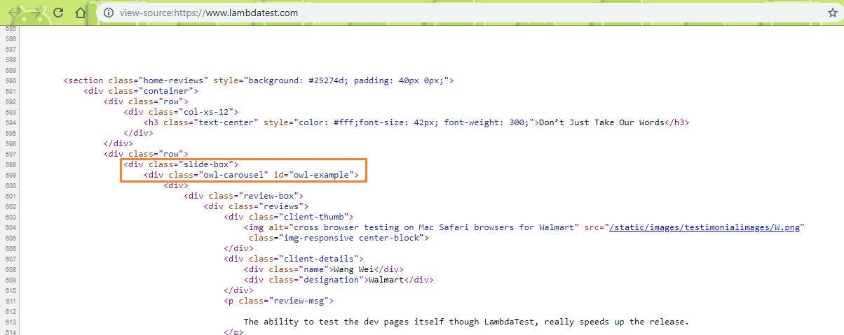 همانطور که انتظار میرفت اولین مورد آزمایشی شکست میخورد، زیرا div-id مورد جستجو در صفحه وب مورد آزمایش وجود ندارد. زمان جستجو پس از 5 ثانیه پایان مییابد. از طرف دیگر مورد آزمایشی دوم عبور کرده، زیرا ‘owl-example’ در صفحه وب وجود دارد. برای تأیید این موضوع لطفا به منبع LambdaTest مراجعه کنید. (که همان صفحه هم مورد آزمایش ماست)