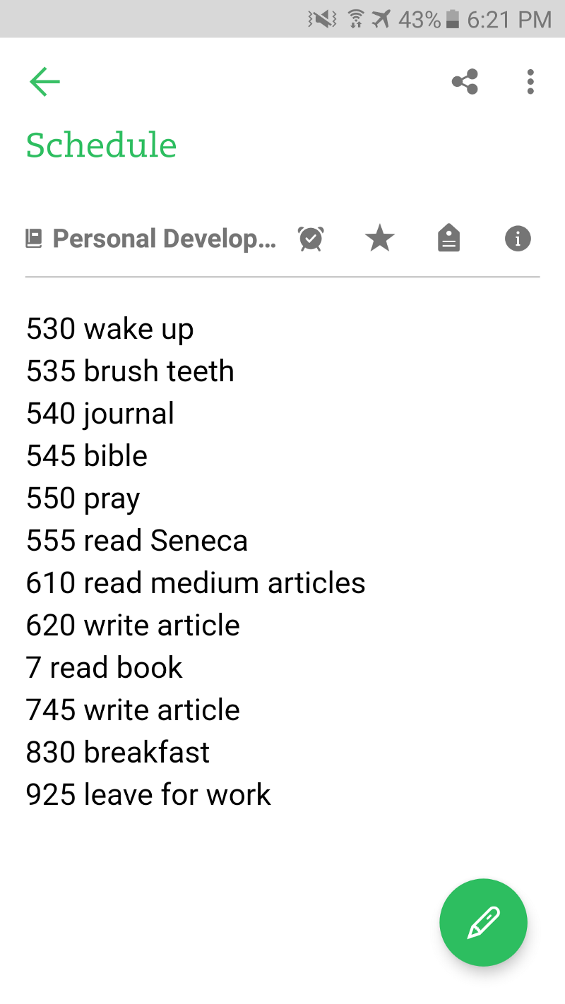 ساختن جدولی که نشان میداد تک تک دقیقه های صبح من چگونه میگذرد نقش حیاتی در سحرخیز شدن من داشت. اگر میتوانستم بدانم که در هر دقیقه چه کار میکنم، پیاده سازی یک عادت برایم آسانتر میشد.