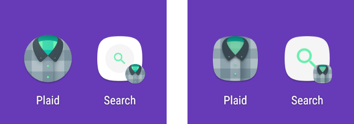 برای پیاده سازی برنامه Plaid، من ابتدا آیکونهای جدیدی را در پیکربندی v26 اضافه کردم که برای adaptive grid و keyline دوباره طراحی شده است. من از این روش راضی نبودم زیرا آنها اساساً نسخههای کوچک آیکونهای v25 بودند. یعنی من الان دو آیکون برای نگه داری داشتم. در نهایت تصمیم گرفتم که آیکون v25 را به یک پیشزمینه(به عنوان مثال آیکون جستجو) و پسزمینه(دایره خاکستری) تبدیل کنم و آنها را با یک LayerDrawable ترکیب کنم.