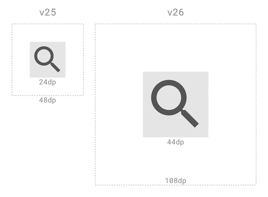 </layer-list>سپس میتوانم از همان asset پیشزمینه در adaptive icon استفاده کنم. در v25 آیکونهای میانبر 24dp در داخل asset، 48dp هستند، در v26، 44dp در داخل asset، 108dp هستند: