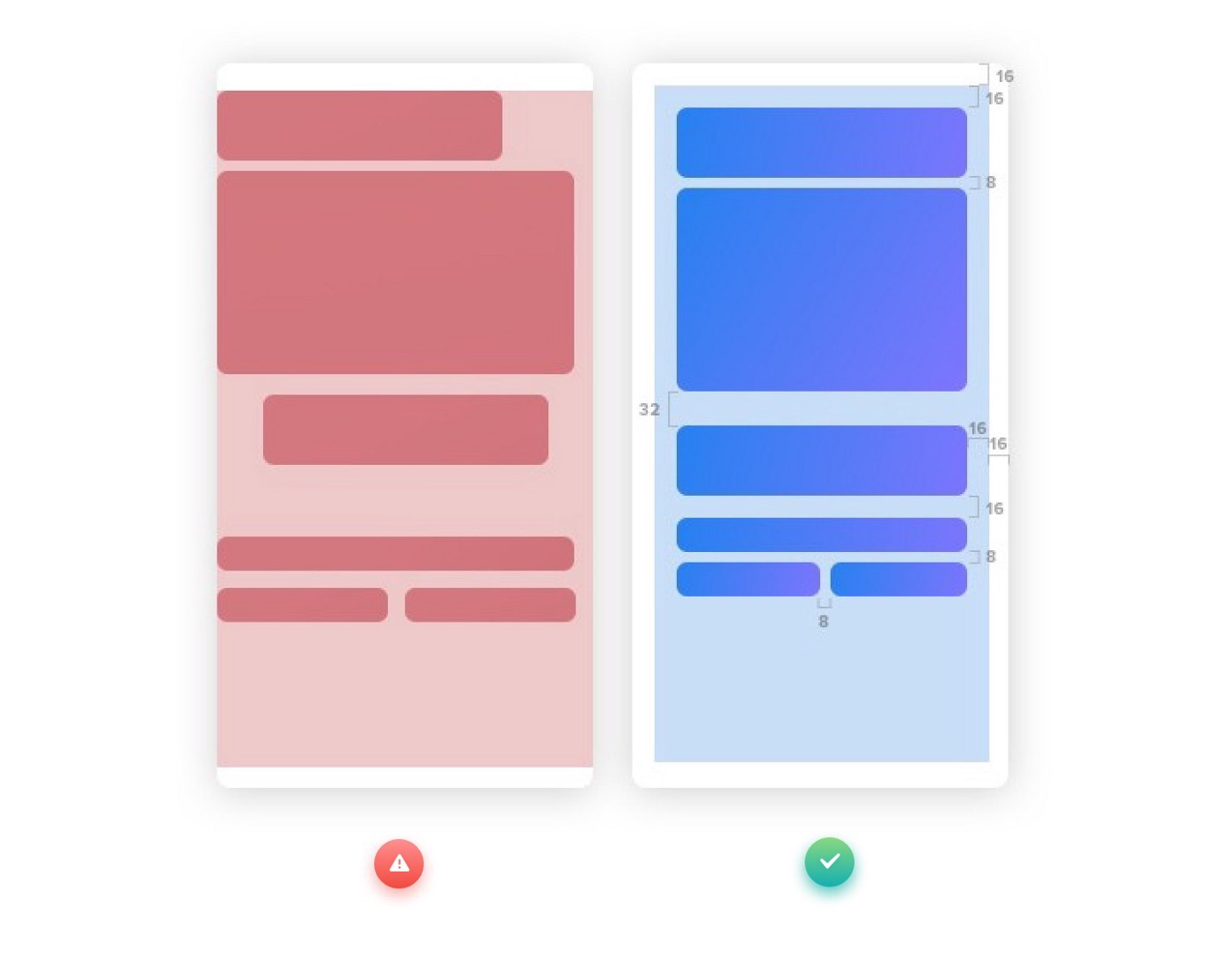 اکثر محصولات با هم راستا شدن، اشتباهات مشابه را دوباره تکرار میکنند. اگر برخی از نمونههای بد را مشاهده کنید، بخش طراحی کردن محصول بسیار آسانتر خواهد شد. بسته به برنامهی خود فضای سفید را اضافه کنید، عناصر را در کنار یکدیگر قرار داده و دکمهها را مرتب کنید.