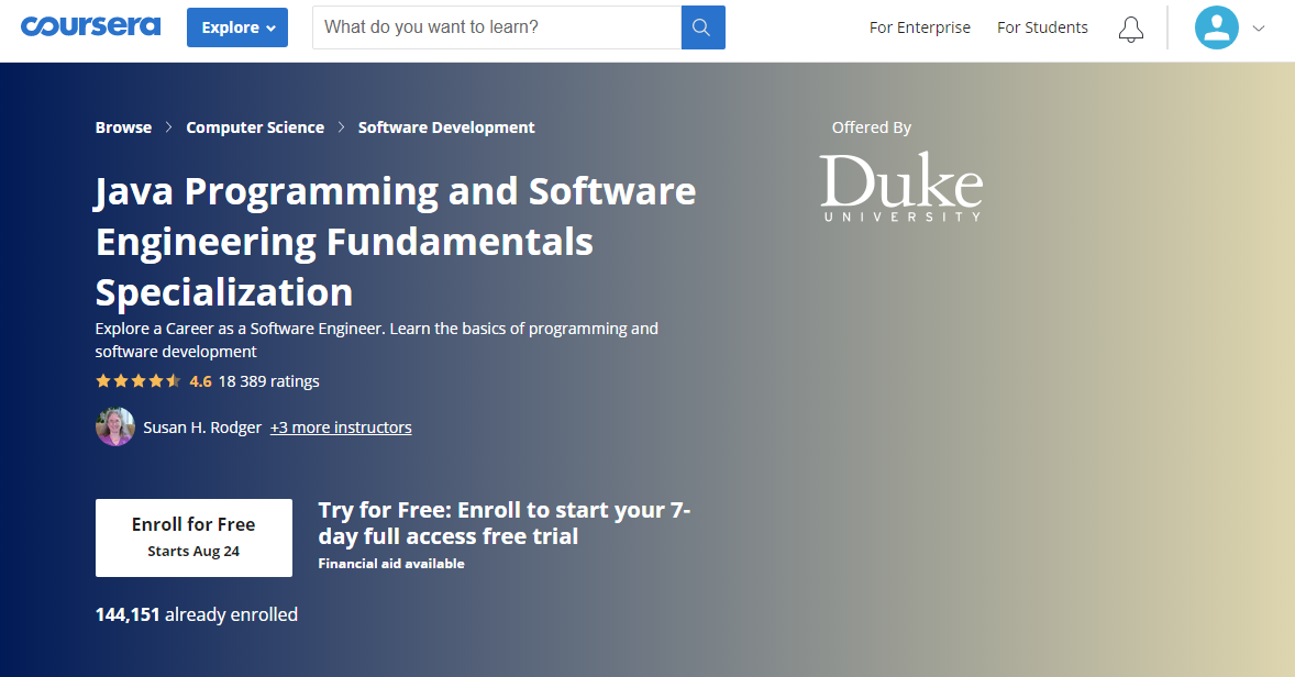 Coursera یک پلتفرم آموزشی آنلاین است که به شما این امکان را میدهد تا در بسیاری از دورهها به صورت رایگان ثبت نام کرده و یا دورههای پولی را انتخاب کنید. این سایت بسیاری از دورههای برنامه نویسی را نیز فهرست میکند، مانند: