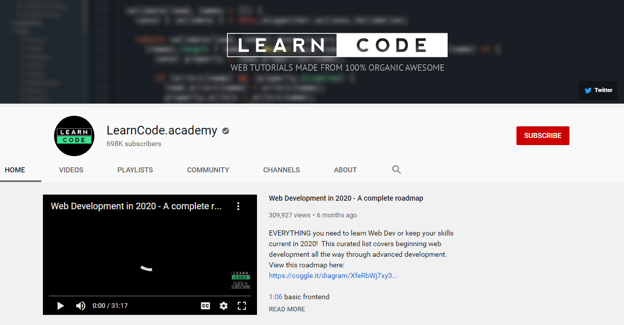 LearnCode.academy یک کانال یوتیوب است که تعداد زیادی از عناوین مربوط به توسعه نرم افزار را پوشش میدهد. این کانال شامل آموزشهایی برای افراد مبتدی و همچنین ابزارهایی پیشرفته برای برنامهنویسان با تجربه در زمینه توسعه وب است.