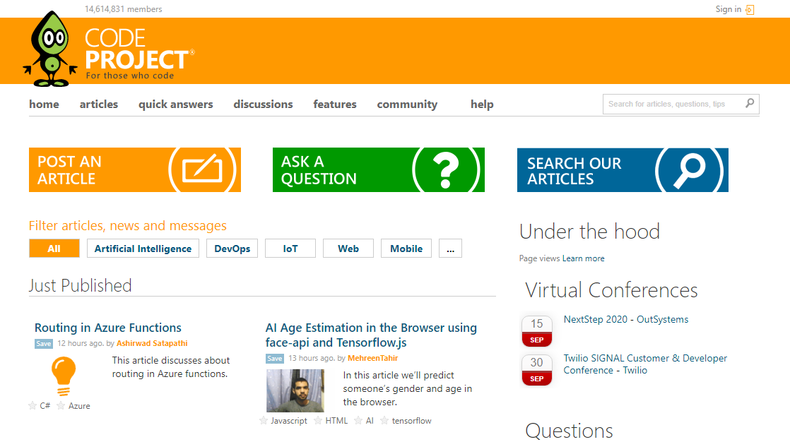 CodeProject دارای جامعهای است که چند مقاله و آموزش مرتبط با توسعه وب، نرم افزار، زبانهای برنامه نویسی و غیره را گرد هم آورده است.