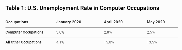 توسعه نرم افزار یکی از صنایعی است که اشتغال نسبتاً پایداری را به همراه دارد. برخلاف بسیاری از مشاغل دیگر، فعالیتهای حرفهای که با کامپیوتر انجام میشود در طول اپیدمی هم دارای نرخ بیکاری کمتری است. جدول زیر را مشاهده کنید.