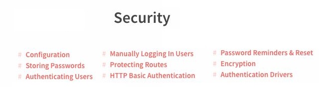درحین توسعه ی اپلیکیشن هرکسی باید چندین روش برای امن کردن اپلیکیشن خود استفاده کنه. لاراول در زمینه امنیت بسیار حساس هست. اون پسوردها رو بصورت کدگذاری شده استفاده می کنه که یعنی پسوردها و متن های امنیتی هیچ وقت نباید بصورت متن خالص در دیتابیس ذخیره بشوند. لاراول از الگوریتم Bcrypt hashing برای تولید یک شکل امن و رمزگذاری شده از پسوردها استفاده می کنه. لاراول از حالات آماده ی SQL استفاده می کنه که باعث میشه حملات Injection به سایت ناموفق باشه. علاوه بر این لاراول یک راه راحت برای جلوگیری از نفوذ کاربران با تگ هایی مثل <script> فراهم می کنه. اینجا یک سری ویژگیهای امنیتی که لاراول داره لیست شده :