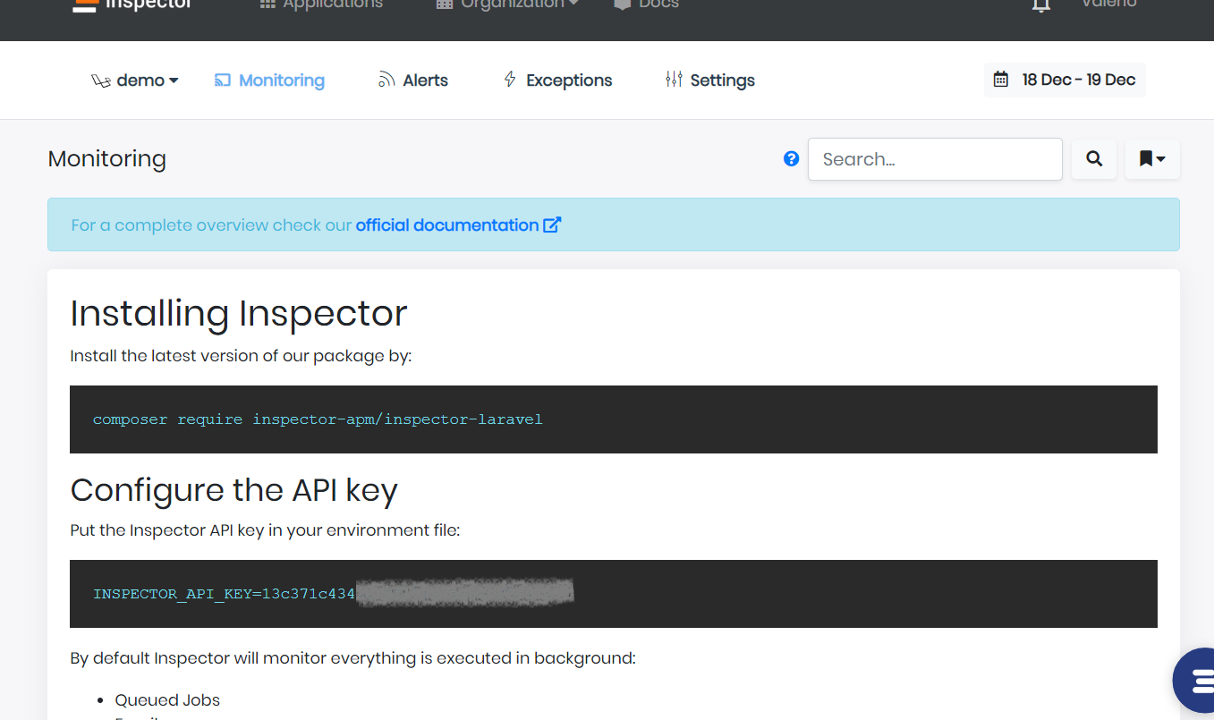 برای جستجوی دمو خود به https://app.inspector.dev/home بروید.