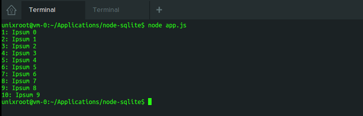 برای اجرای کد دستور node app.js وارد کنید (بجای app.js نام فایلی که ساختید بگذارید). بعد از اینکار متوجه فایل mydb.sql در فولدر پروژه میشید. این کد یک جدول در دیتابیس میسازه و تعدادی عدد اضافه میکنه و در کنسول نمایش میده :