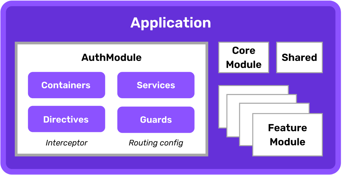 برای یافتن مکان مناسب در برنامه به منظور اجرای ویژگیهای احراز هویت، باید یک قدم به عقب برگردیم و در مورد معماری انگولار و طراحی ماژولار فکر کنیم. برنامه ما به ماژولهایی تقسیم میشود که هر یک ویژگیهای خاص خود را دارد. بیشتر کدهایی که برای این آموزش خواهیم داشت متعلق به AuthModule است. همچنین این ماژول موارد زیر را در بر میگیرد: