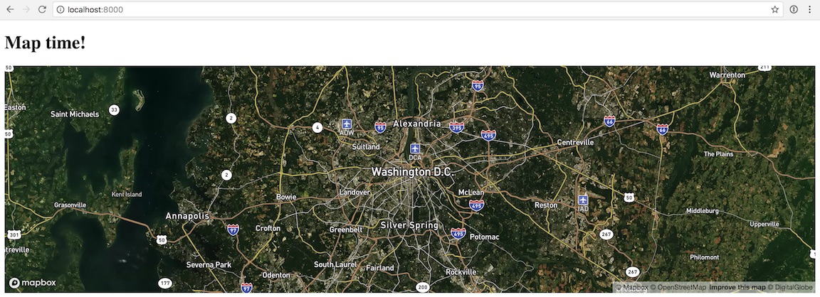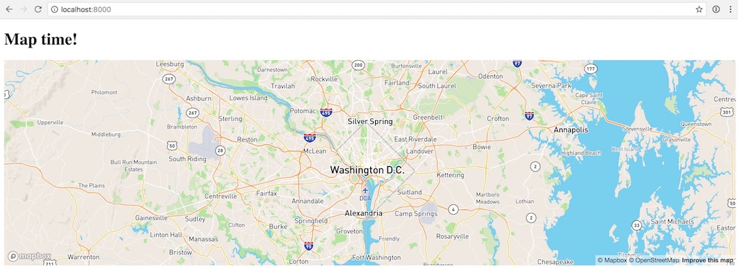 اولین عدد در خاصیت center که برابر با مقدار -۷۷.۰۳ است برای تعیین عرض جغرافیایی و دومین مقدار که برابر با ۳۸.۹۱ است برای طول جغرافیایی استفاده میشود. میزان zoom برابر با ۹ است، بنابراین دید نزدیکتری نسبت به مقدار پیشفرض دارد. تمام مقادیر مربوط به شخصیسازی در مستندات مربوط به Mapbox وجود دارد.